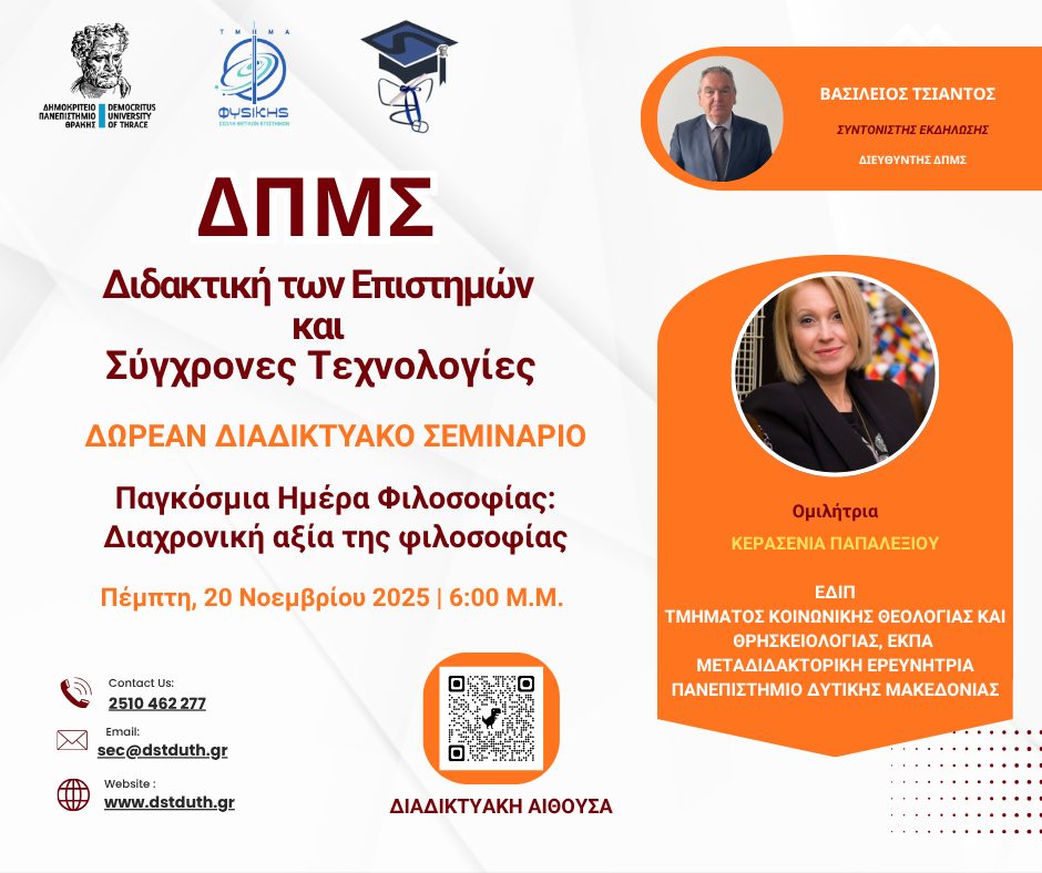 Το Διατμηματικό Πρόγραμμα Μεταπτυχιακών Σπουδών (ΔΠΜΣ) “Διδακτική των Επιστημών και Σύγχρονες Τεχνολογίες” διοργανώνει σειρά σεμιναρίων με γενικό τίτλο “Σύγχρονες Διεπιστημονικές Προσεγγίσεις στην Εκπαίδευση”. Τα σεμινάρια θα ολοκληρωθούν τον Μάιο του 2026. Όσοι συμμετέχοντες παρακολουθήσουν το 80% των διαλέξεων/στρογγυλών τραπεζών θα λάβουν Πιστοποιητικό Παρακολούθησης. Η παρακολούθηση είναι δωρεάν και ανοικτή για το κοινό.